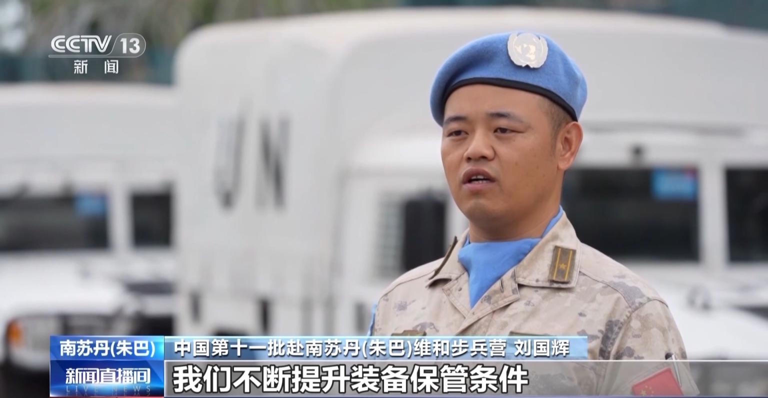 中国第十一批赴南苏丹(朱巴)维和步兵营 刘国辉:针对任务区高温高湿的天气情况,我们不断提升装备保管条件,通过新建装备库、配备除湿降温设备等改善装备存储环境。同时,在常态落实装备维护保养的基础上,不间断组织装备技术整治,制定高效的装备保障措施,着力提升部队复杂环境下装备维护保养能力,确保各项任务的顺利完成。